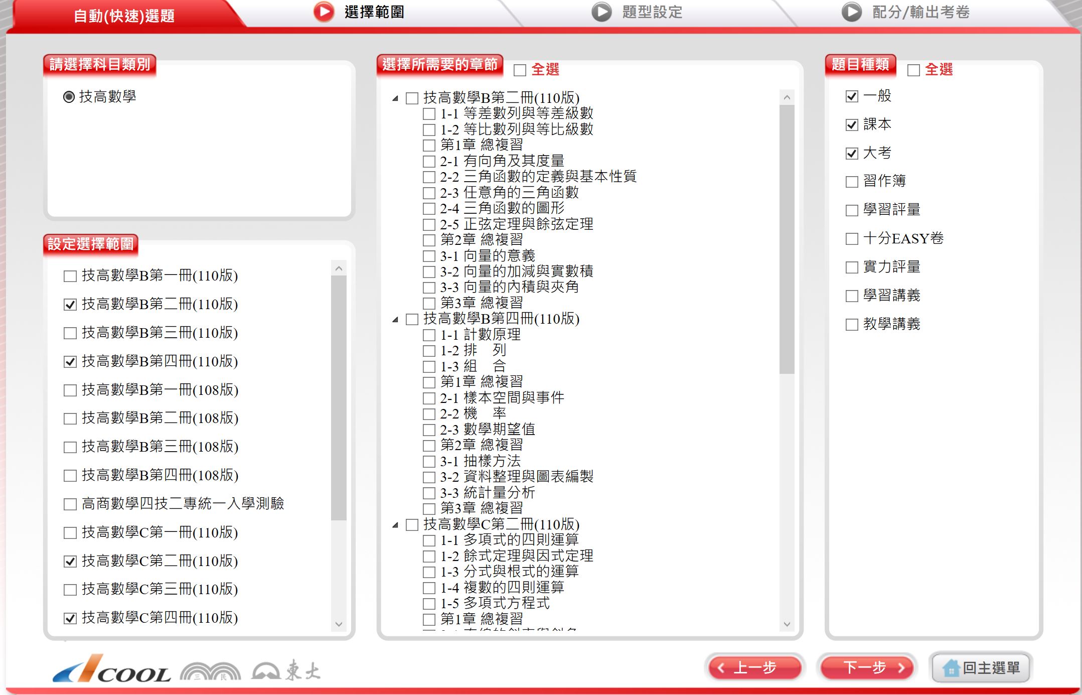 111學年下學期 技術高中命題光碟 三民東大版 數學科(B版、C版 1-4冊)(108課綱) 題庫光碟